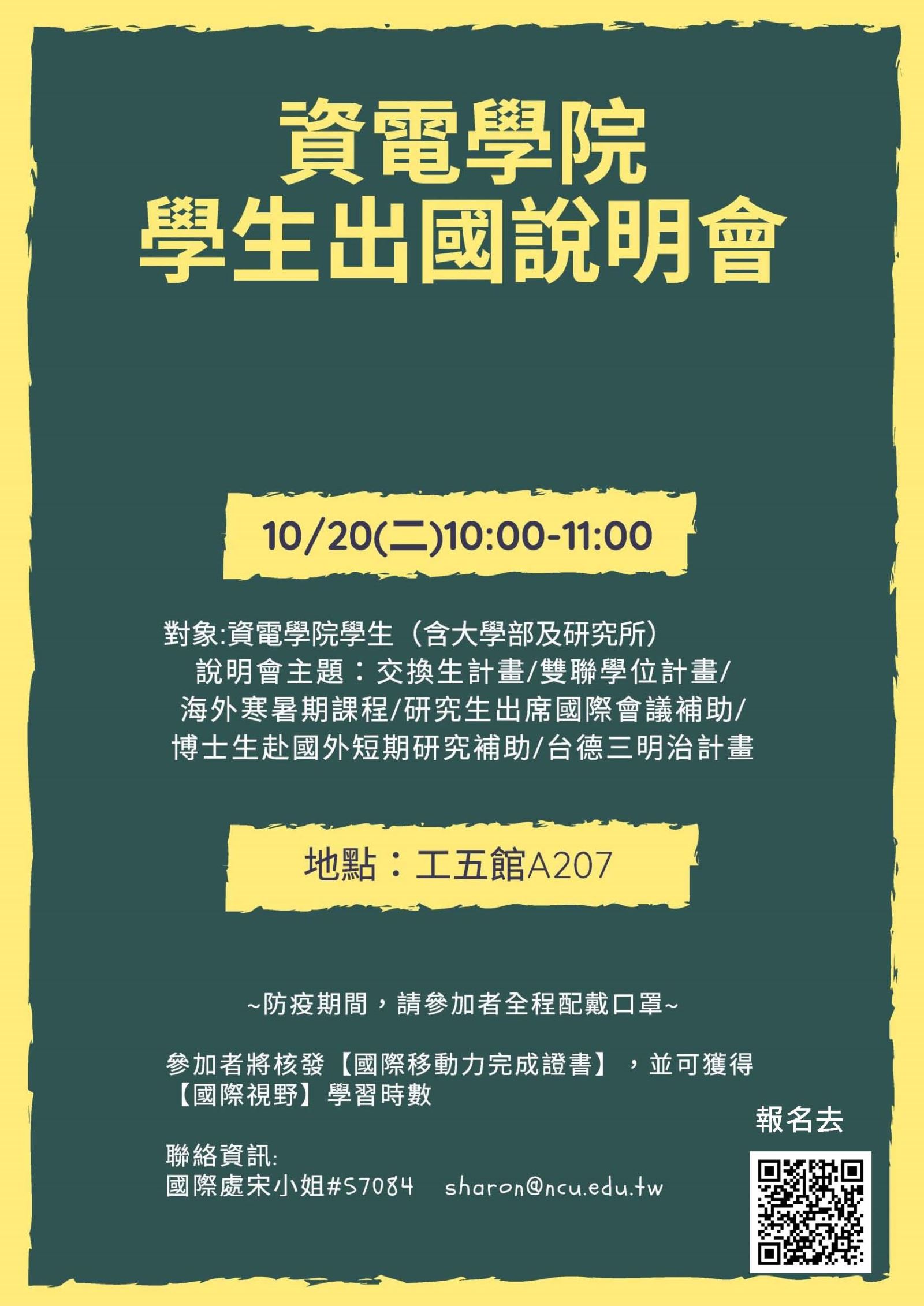 目前已開放報名(portal活動報名系統https://cis.ncu.edu.tw/ActivitySys/activitys/164),請同學踴躍參加。
