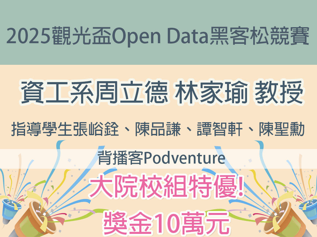 恭賀!!資工系周立德教授和林家瑜教授 指導大學部學生張峪銓、陳品謙、譚智軒、陳聖勳 參加2025觀光盃Open Data黑客松以「背播客Podventure」榮獲大專院校組特優,獎金10萬元!