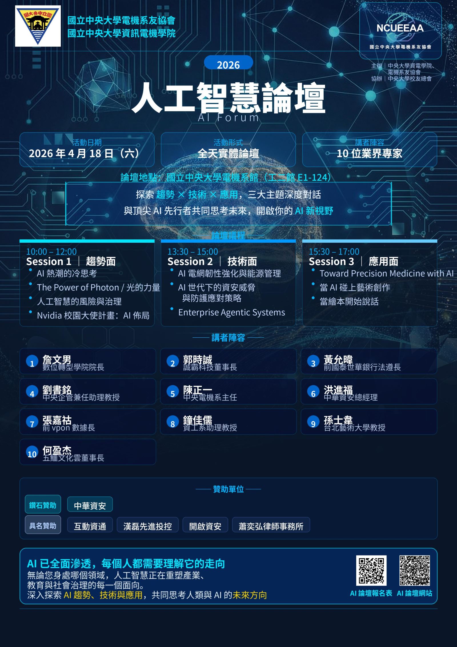 電機工程學系將於115年4月18日(星期六)上午10時至下午5時30分,舉辦「2026人工智慧論壇」,產學界共10位重量級講者,免費報名中(全程參與可得6小時自我探索時數🤲)